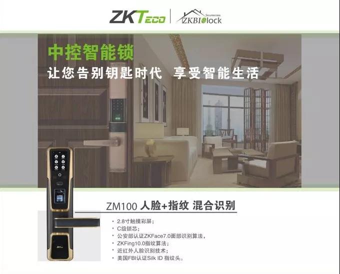 ZM100混合生物識別智能鎖,擁有行業內高質量標準的120小時鹽霧測試和30萬次使用壽命測試,配備2.8寸觸摸彩屏和可夜間識別的近紅外攝像頭,標配Slik  ID光學指紋頭,采用ZK  Face7.0算法的人臉識別技術.擁有高速CPU,可便捷升級,使用高續航聚合物鋰電池,可連續使用6000到8000次左右。是中控門禁智能鎖發展歷程的標志性產品,也是中控門禁智能鎖打入市場和適應消費者需求的主打產品。