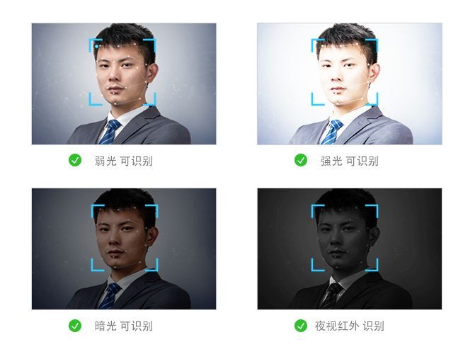 為了應(yīng)付復雜的環(huán)境,采用的人臉識別技術(shù)一定要支持強光、弱光、黑夜背光等多種復雜環(huán)境,并且可以檢測出正臉、側(cè)臉等多