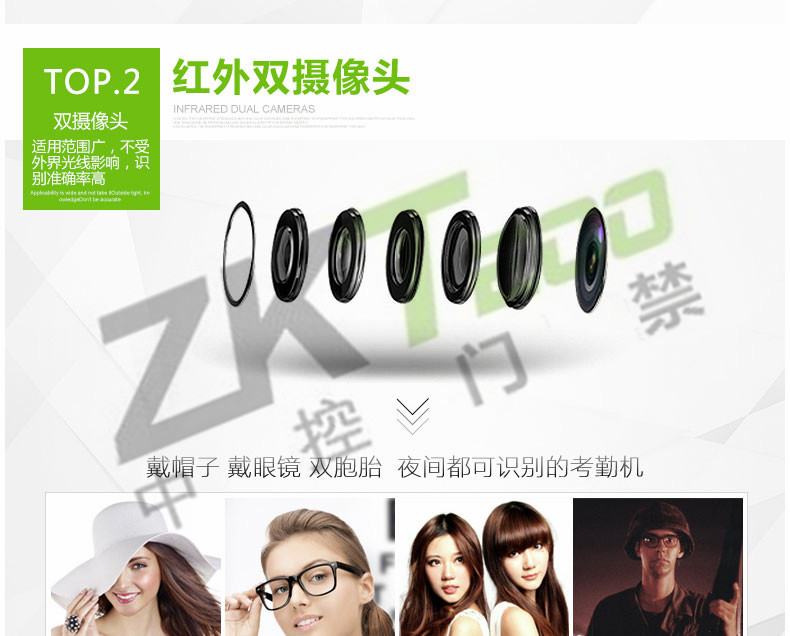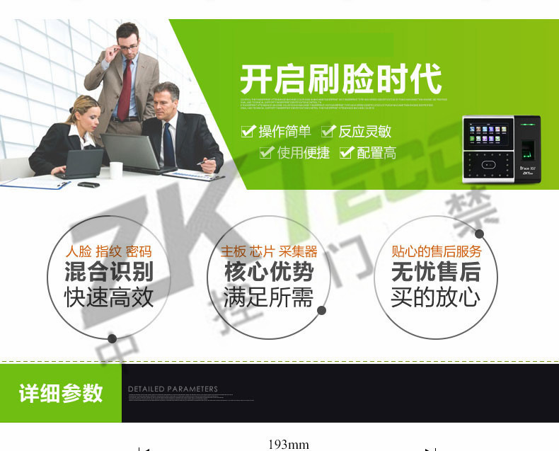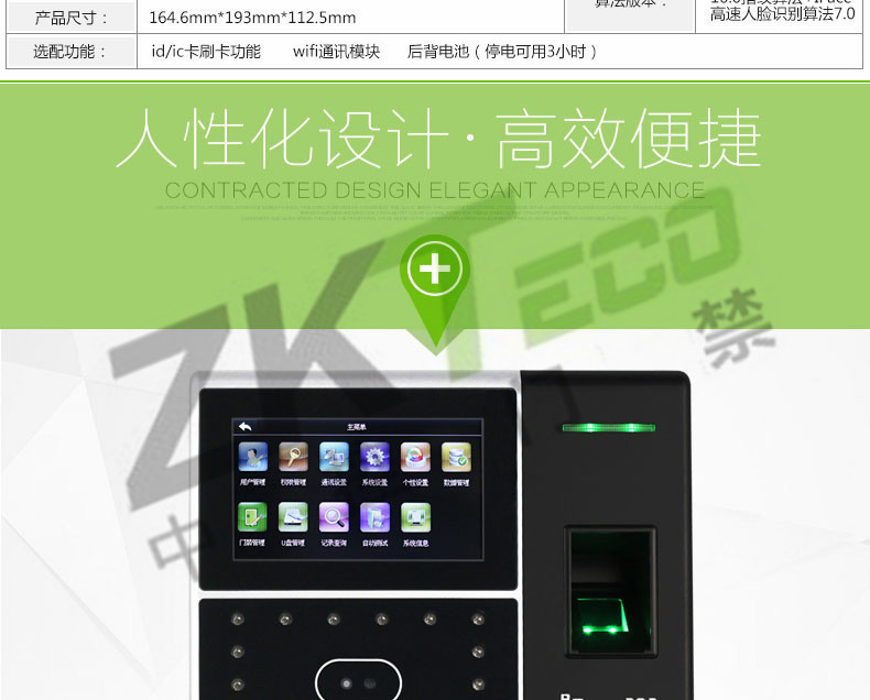 該產(chǎn)品采用了中控科技最新的ZEM600核心板,ZKFinger10.0指紋面部混合識(shí)別算法,容量大,識(shí)別速度快,集成高分辨率夜視紅外和彩色雙攝像頭功能,適用范圍廣,不受外界光線的影響,無(wú)論是在強(qiáng)光下還是在黑暗中也能進(jìn)行有效識(shí)別。該系列已經(jīng)通過(guò)了超過(guò)10萬(wàn)面部數(shù)據(jù)庫(kù)長(zhǎng)達(dá)2年的測(cè)試,同時(shí)該算法也在美國(guó)San Jose大學(xué)年度測(cè)試中名列前矛,在用戶舒適度方面獲得了最佳評(píng)分。iFace采用了嵌入式中控Multi-Bio CPU,主頻為630MHZ,可以處理高達(dá)1:20000的1:N速度,符合人體工程學(xué)的外觀設(shè)計(jì),工業(yè)設(shè)計(jì)由德國(guó)專業(yè)公司主導(dǎo)完成,模具采用了PC材料+蝕紋工藝+鏡面工藝,采集比對(duì)就如照鏡子一般,支持4.3寸全觸摸TFT,僅有6個(gè)狀態(tài)功能鍵,其它按鍵在TFT上全觸摸操作。標(biāo)配TCP/IP通訊方式,支持跨網(wǎng)段跨網(wǎng)關(guān)連接。