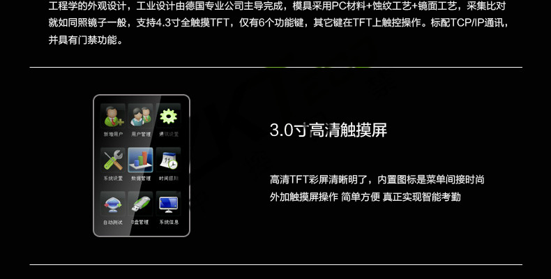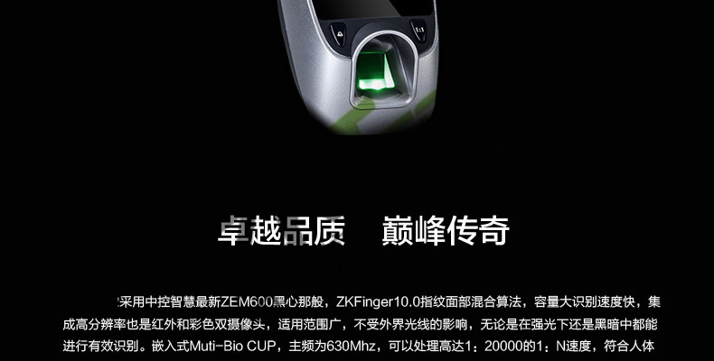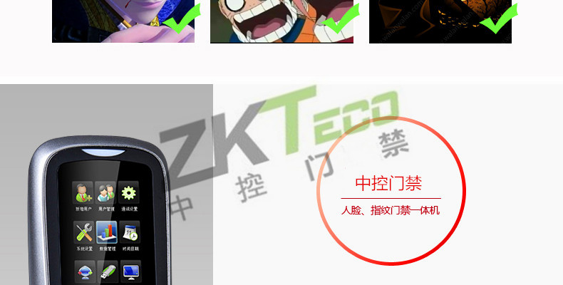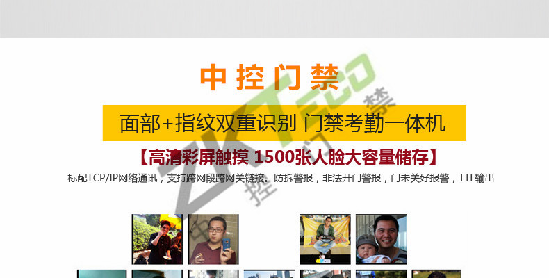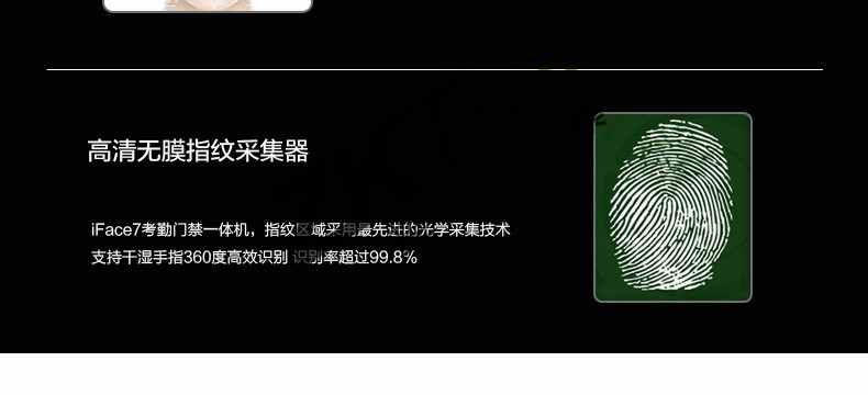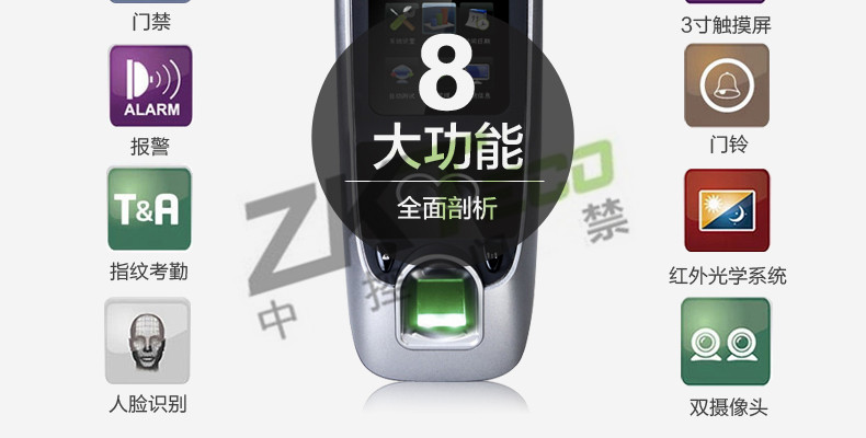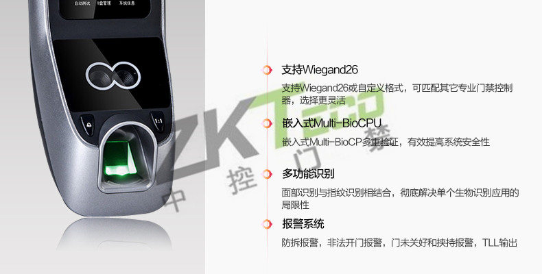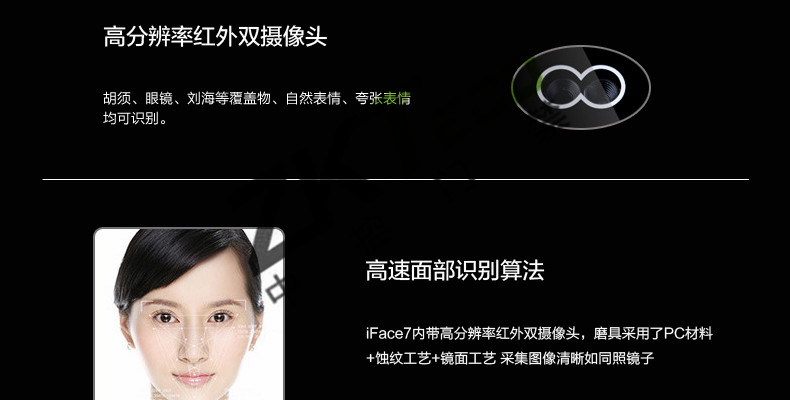 面部門禁一體機(jī)iFace7是基于ZEM800多媒體開(kāi)發(fā)平臺(tái)設(shè)計(jì)的一款集指紋和面部混合驗(yàn)證的3寸觸摸彩屏門禁終端,采用ZKFinger VX10.0最新指紋算法及ZKFace VX7.0面部算法,識(shí)別速度快,靈活選擇面部、指紋或者密碼開(kāi)門方式,集成高分辨率夜市紅外和雙攝像頭功能,適應(yīng)范圍廣。支持高級(jí)門禁功能(不同時(shí)間段開(kāi)門,多人開(kāi)門,拆機(jī)報(bào)警,門未關(guān)好報(bào)警,門被非法打開(kāi)報(bào)警,開(kāi)門按鈕輸入,有限門鈴接口,脅迫報(bào)警等)。標(biāo)配的TCP/IP通訊,支持跨網(wǎng)段跨網(wǎng)關(guān)連接,是安防工程的首先產(chǎn)品,可用于銀行、部隊(duì)、機(jī)場(chǎng)等高安全場(chǎng)所。